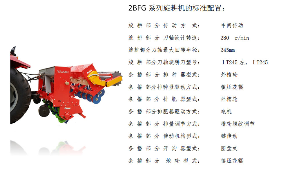 旋耕施肥播種機是一款多功能農業機械設備,它集旋耕、施肥、播種、覆土、鎮壓于一體,一次作業可完成多項任務,減少機械進地次數,節約成本。微電腦電機控制施肥,無級調速,專用設計不銹鋼導肥槽,保證撒肥面積均勻,鎮壓輥后驅動,增加防滑裝置,保證播種質量,配套圓盤開溝器,保證種子落地準確,防止纏草,一機多用,經過調整可以切換為花生平播或壟播,小麥、旱稻、油菜、高梁平播等多種狀態。主要功能如下: