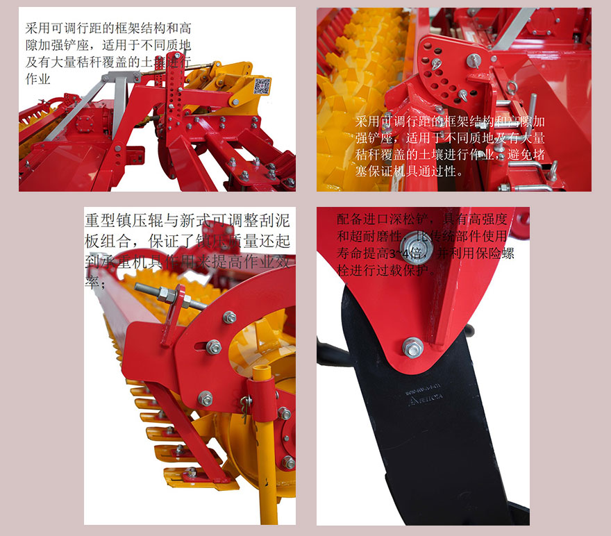 6、深松單元采用鑿型鏟翼式結構組合,單鏟幅寬可達26厘米,深度可達33厘米。翼鏟高度可調,可滿足不同耕作需求;