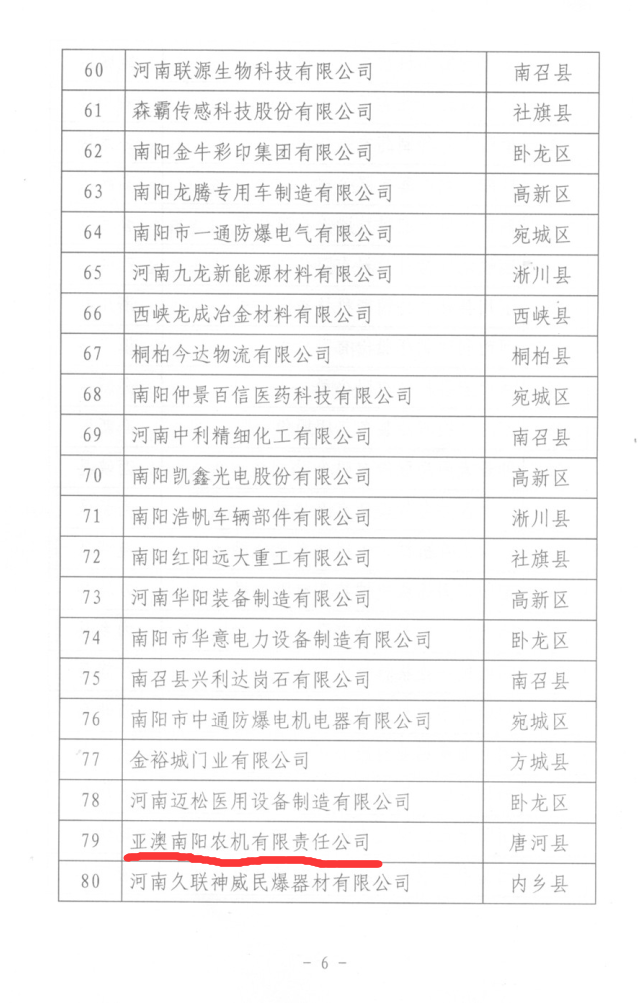 為深入實(shí)施創(chuàng)新驅(qū)動(dòng)發(fā)展和“兩輪兩翼”發(fā)展戰(zhàn)略,增強(qiáng)全市企業(yè)自主創(chuàng)新能力和核心競(jìng)爭(zhēng)力,引領(lǐng)促進(jìn)企業(yè)成為技術(shù)創(chuàng)新主體,按照《南陽(yáng)市科技創(chuàng)新百?gòu)?qiáng)企業(yè)考核評(píng)定辦法》要求,亞澳農(nóng)機(jī)等6家企業(yè)榮獲此榮譽(yù)。