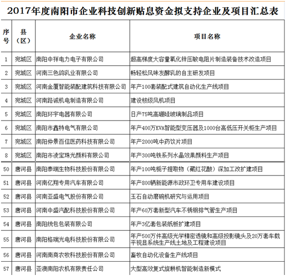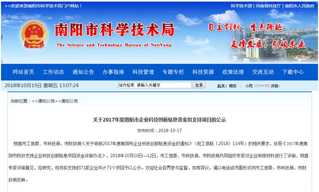 根據市工信委、市科技局、市財政局《關于申報2017年度南陽市企業科技創新貼息資金的通知》(宛工信聯〔2018〕114號)的相關要求,依照《2017年度南陽市財政支持企業科技創新貼息項目資金評審辦法》,2018年10月10日—12日,市工信委、市科技局、市財政局共同組織專家對企業申報材料進行了評審,根據專家評審意見,經研究,現將擬支持的71家企業共計71個項目予以公示。歡迎社會各界參與監督,如有異議,請以電話或書面形式向市工信委、市科技局、市財政局反映。