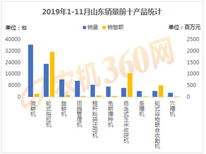 2019年1-11月,上榜山東用戶購機量前十的農(nóng)機產(chǎn)品如下圖所示,微耕機、輪式拖拉機、旋耕機等10種農(nóng)機合計購買力11.5萬多臺,是山東農(nóng)機總銷量的86.54%,對這10類農(nóng)機的購機支出達38.55億元。